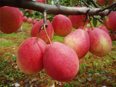 2、愛宕梨:品種來源:日本岡山縣龍井種苗株式會社以二十世紀×今村秋雜交育成,1982年命名。果實性狀:果實扁圓形;果實大型,平均單果重415克,果個過大者或樹勢衰弱時果形不正。果皮黃褐色,果點較小,中密,果面較光滑。套袋果果皮淡黃色,果點不明顯。果肉白色,肉質細脆,汁多,石細胞少,可溶性固形物含量12.0%~16.0%,味酸甜可口,有類似二十世紀梨的香味,品質上。成熟極晚,10月中下旬成熟,耐貯性極強。