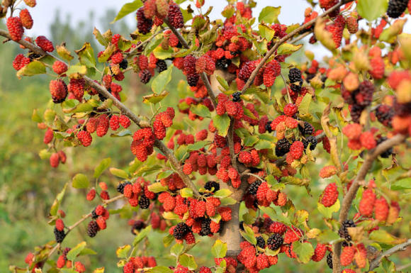 桑, 落葉喬木或灌木,高可達(dá)15米。樹(shù)體富含乳漿,樹(shù)皮黃褐色。葉卵形至廣卵形,葉端尖,葉基圓形或淺心臟形,邊緣有粗鋸齒,有時(shí)有不規(guī)則的分裂。葉面無(wú)毛,有光澤,葉背脈上有疏毛。雌雄異株,5月開(kāi)花,葇荑花序。果熟期6~7月,聚花果卵圓形或圓柱形,黑紫色或白色。喜光,幼時(shí)稍耐陰。喜溫暖濕潤(rùn)氣候,耐寒。耐干旱,耐水濕能力極強(qiáng)。原產(chǎn)中國(guó)中部,現(xiàn)南北各地廣泛栽培,尤以長(zhǎng)江中下游各地為多。葉為桑蠶飼料。木材可制器具,枝條可編籮筐,桑皮可作造紙?jiān)希i┛晒┦秤谩⑨劸疲~、果和根皮可入藥。